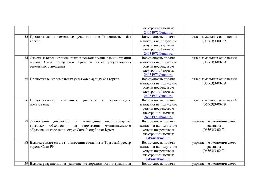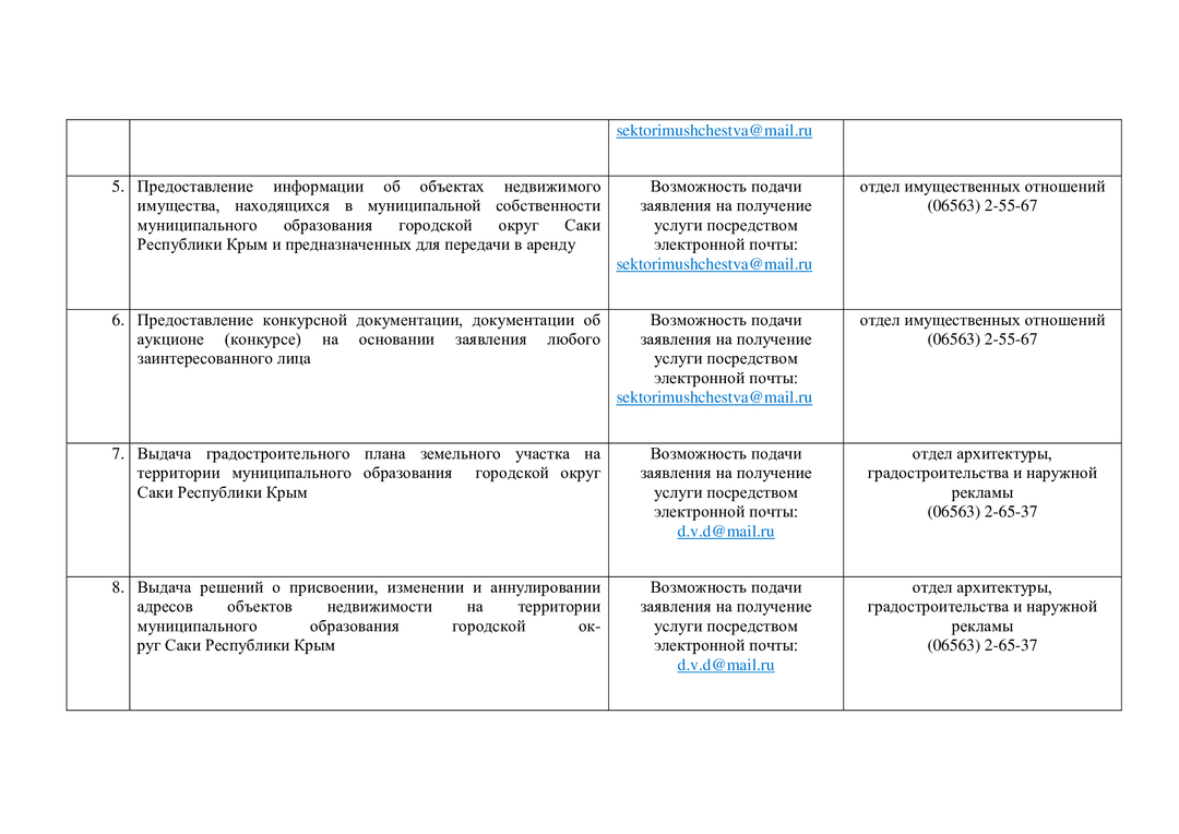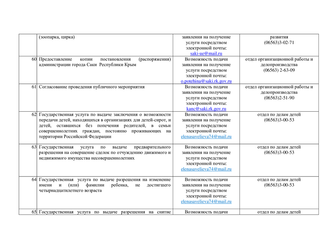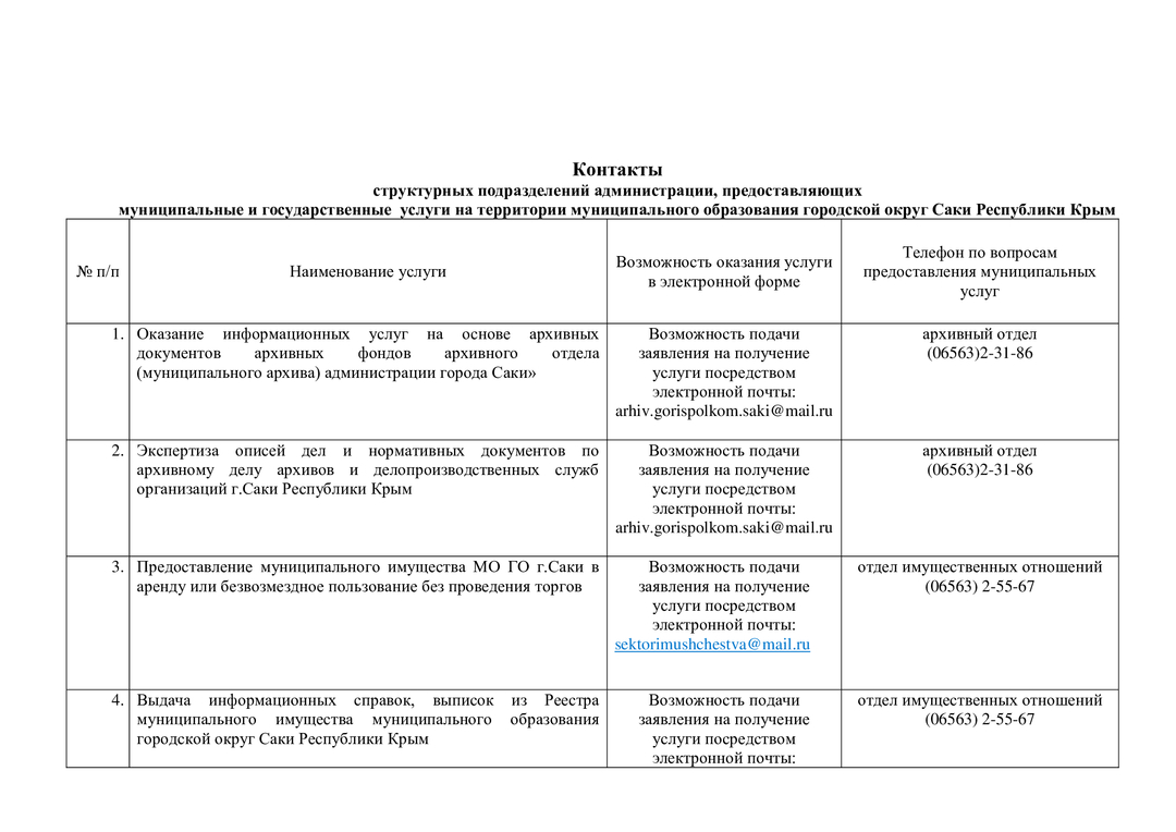 Контакты структурных подразделений администрации, предоставляющих муниципальные и государственные услуги на территории муниципального образования городской округ Саки Республики Крым