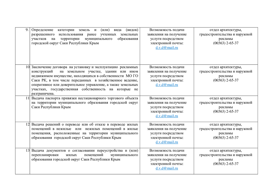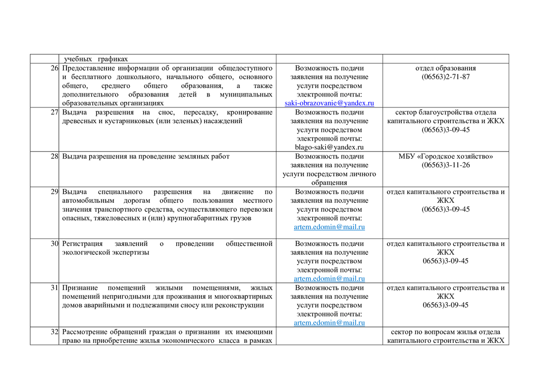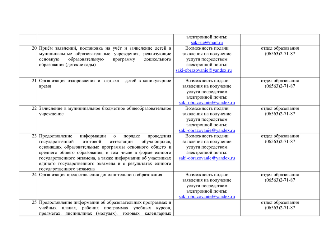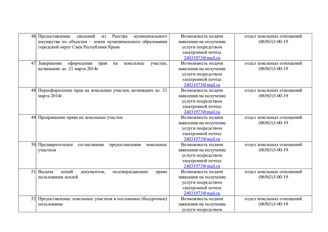 Контакты структурных подразделений администрации, предоставляющих муниципальные и государственные услуги на территории муниципального образования городской округ Саки Республики Крым